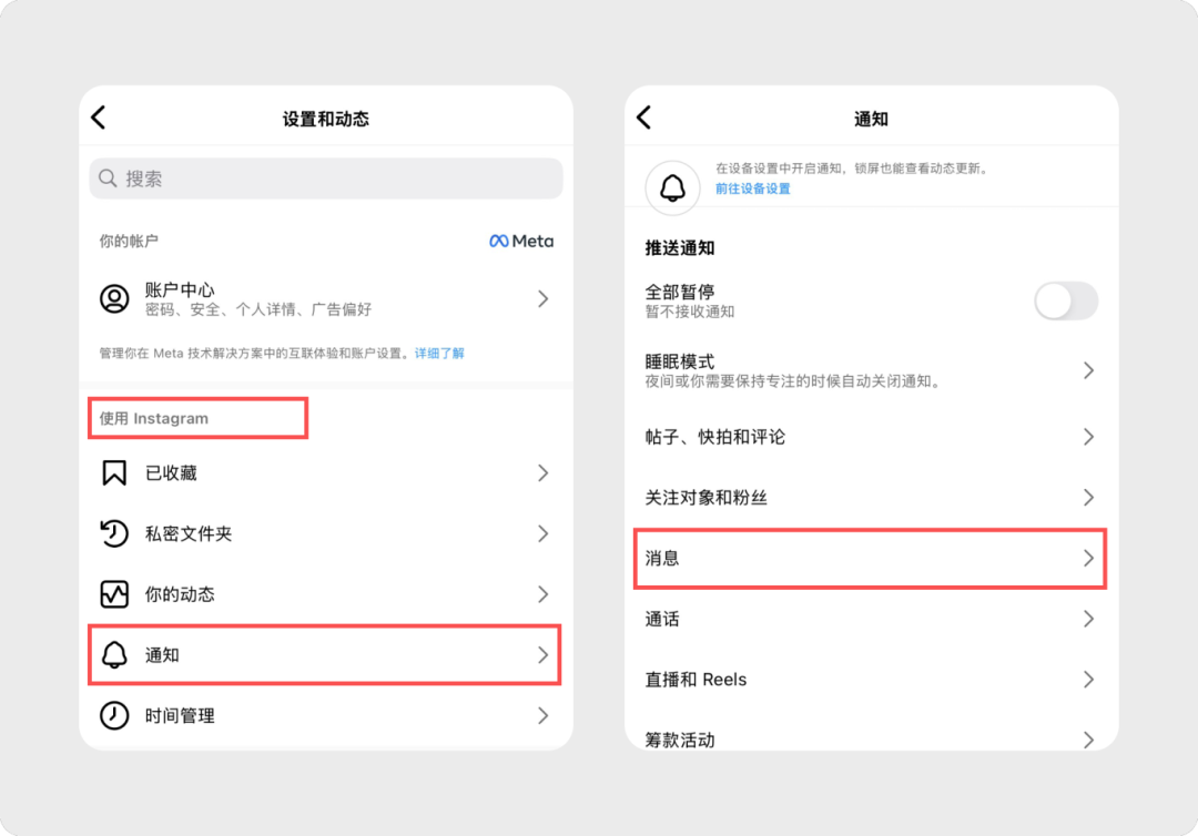 Instagram App 中设置、消息、通知的层级关系