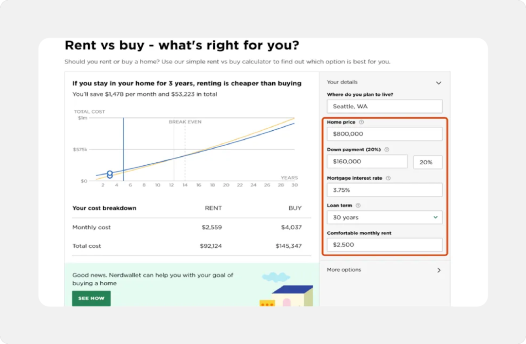 更好的解释性设计也可以是将陌生的新功能以案例的形式展示给用户,并支持调整各项参数,让用户直观的看到设置带来的变化。NerdWallet 在确定的时间轴中告诉用户是买房便宜还是租房便宜。同时,用户也可以调整房价、租金、成本、利率、年数等属性让用户查看不同维度的数据对结果的影响。