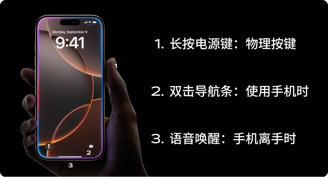 以 Siri 为例,你可以用电源键、语音唤醒或双击屏幕内底部导航条的方式唤起 AI 助手。无论是用手机时、离手时、还是懒得动手时,都可以通过“零层级”的交互方式最高效地唤醒 AI 助手。一旦你不需要它时,只需要点一下屏幕或什么都不做,就可以让它自动退出。