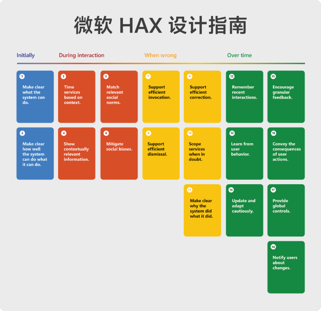 或许我们可以在已有的设计哲学中找到答案。微软HAX(Human-AI eXperience)设计指南中——这套由微软研究院2019年在 CHI 会议提出、历经49名设计师的用户研究、覆盖20类主流 AI 产品的验证的AI 交互设计指南,旨在以”增强而非取代”的理念重塑人机关系。