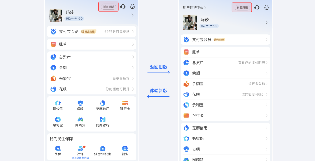 像支付宝个人中心的改版,首次进入新页面会有一个“页面布局全新升级”的提示,用户可以自主选择“开始体验”或者“稍后体验”。