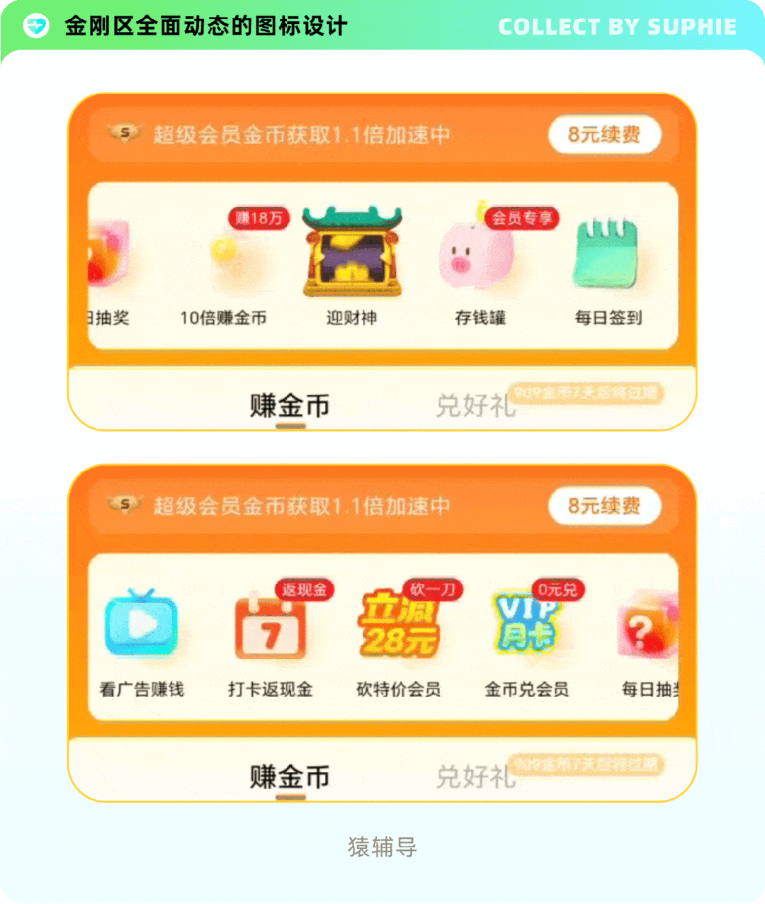 优点:金刚区的图标基本实现了全面动态,引导性比较强,让用户每个都想点进去看看,适合运用于有强引导功能的入口。