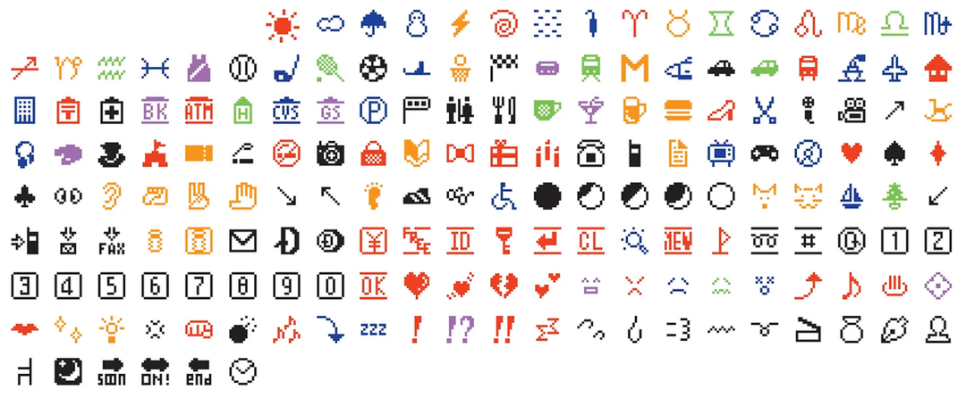 后来到了1999年,日本电信公司Docomo创造了第一批“表情符号”,突破了纯文字交流的局限。当时设计师栗田重隆一共设计了176个表情,其中就有个菱形十字星图案 (左下角),能把这个图案加进去估计就是因为它在当时的日本流行文化里太有存在感了。