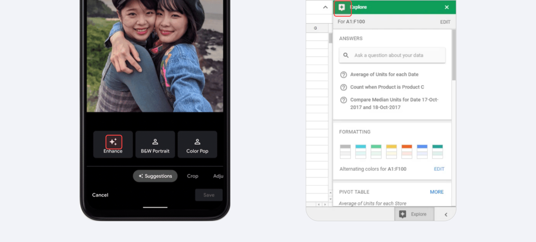 真正让菱形十字星元素和AI绑定在一起,是2020年谷歌相册推出的AI图像增强功能——与其向普通用户解释AI多复杂,不如直接传递“神奇的事情马上要发生”的感觉。同年谷歌表格的“探索”功能也用了菱形十字星元素,通过机器学习给用户推荐主题。这大概是谷歌首次尝试给AI功能建立“视觉符号”。