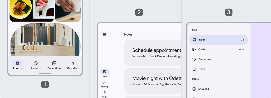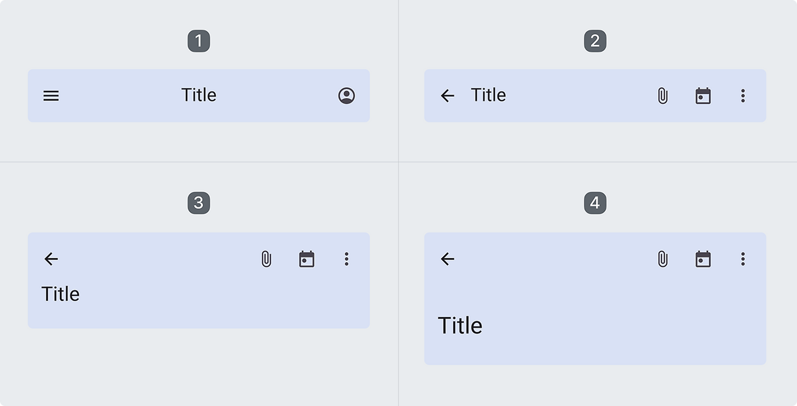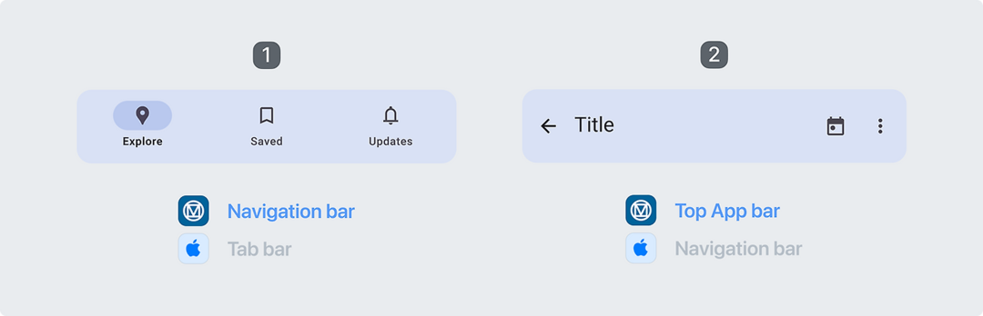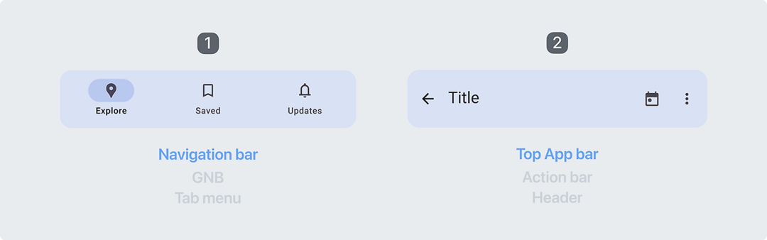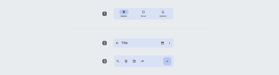 例如在谷歌的Material Design 3设计指南 (MD3) 中,①为导航栏,用于切换应用内3-5个核心功能版块;②为顶部应用栏,③为底部应用栏,聚焦当前页面的导航控制 (如返回)、功能操作 (如搜索) 与信息展示 (如标题)。