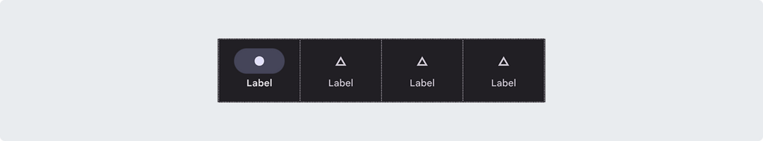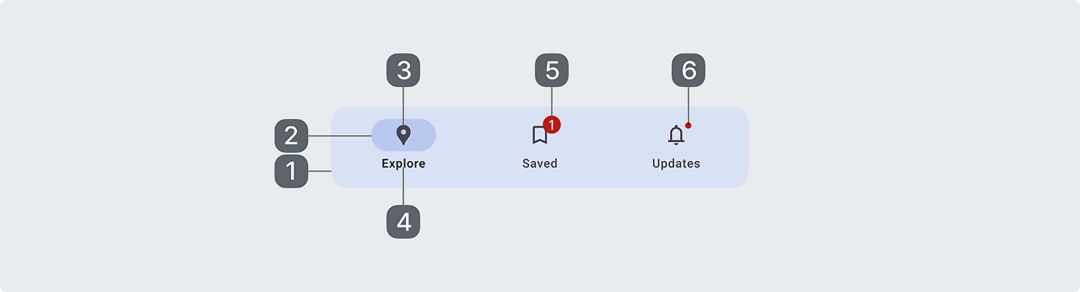 ①为容器、②为激活指示器、③为图标、④为标签文本、⑤为数量提示徽标 (可选)、⑥为状态提示徽标 (可选)