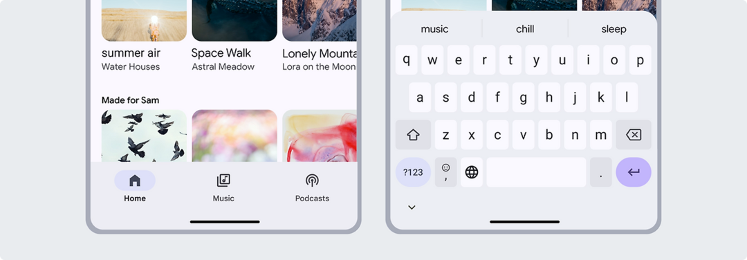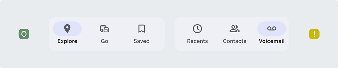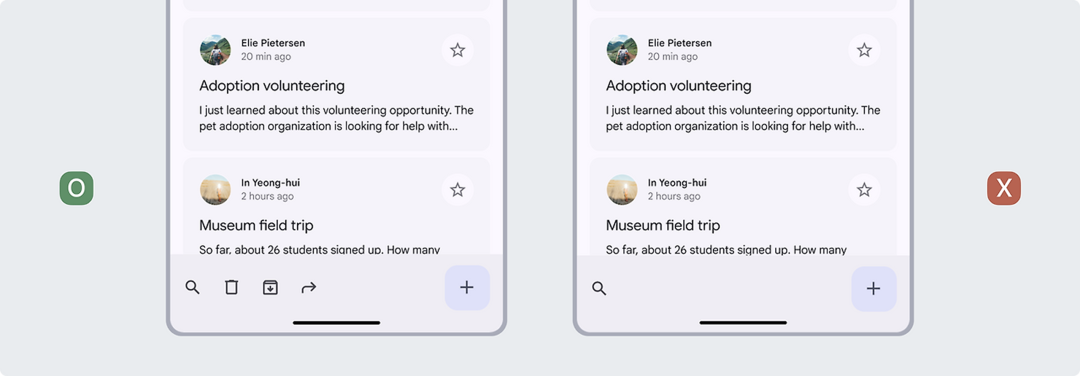 底部应用栏与导航栏不同。导航栏提供前往目标页面的路径,而底部应用栏可以同时包含目标页面和操作。