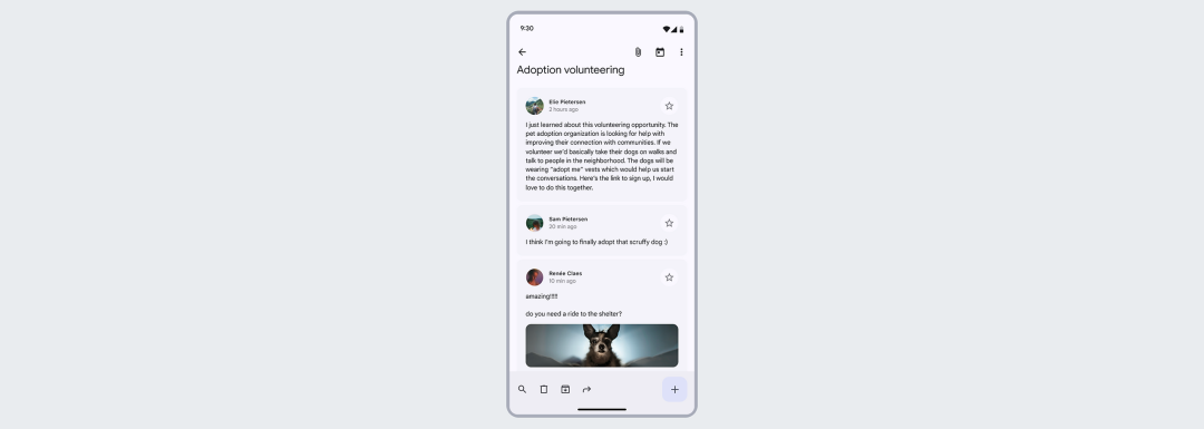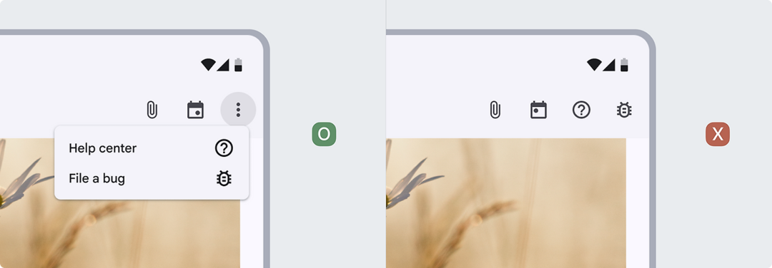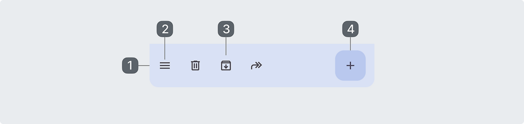 当顶部应用栏与底部应用栏组合使用时,需保持操作结构的一致性:导航类操作集中在顶部应用栏,次要操作折叠为“更多”菜单,放到顶部应用栏的右侧;搜索等高频通用操作需要固定位置,保障用户操作习惯的连贯性;删除等操作放置在顶部应用栏中,强化视觉警示。