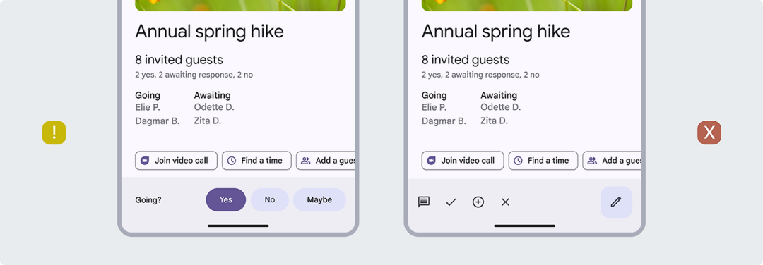 避免在底部应用栏中强行堆砌功能,次要操作可以考虑折叠;不建议放置含义模糊的图标,避免提高用户认知成本。