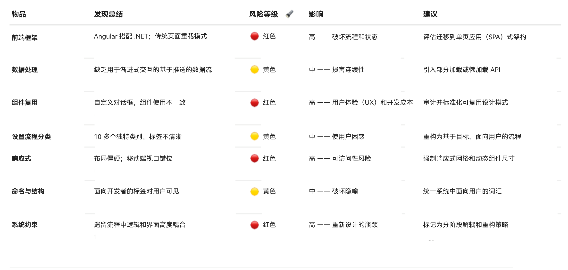 由于架构侧重于在.NET 平台上使用 Angular。数据结构侧重于单页检索,而非更便于用户上下文加载的连续数据流。一些较为特殊的对话框和设置需要自定义控件。其中许多都是此用例特有的,不易更改或修改。主要设置流程分为 10 个类别,并且命名方式独特,需要用户相当熟悉。由于这些原因,在这些方面进行更改虽然影响重大,但需要额外的架构考量。