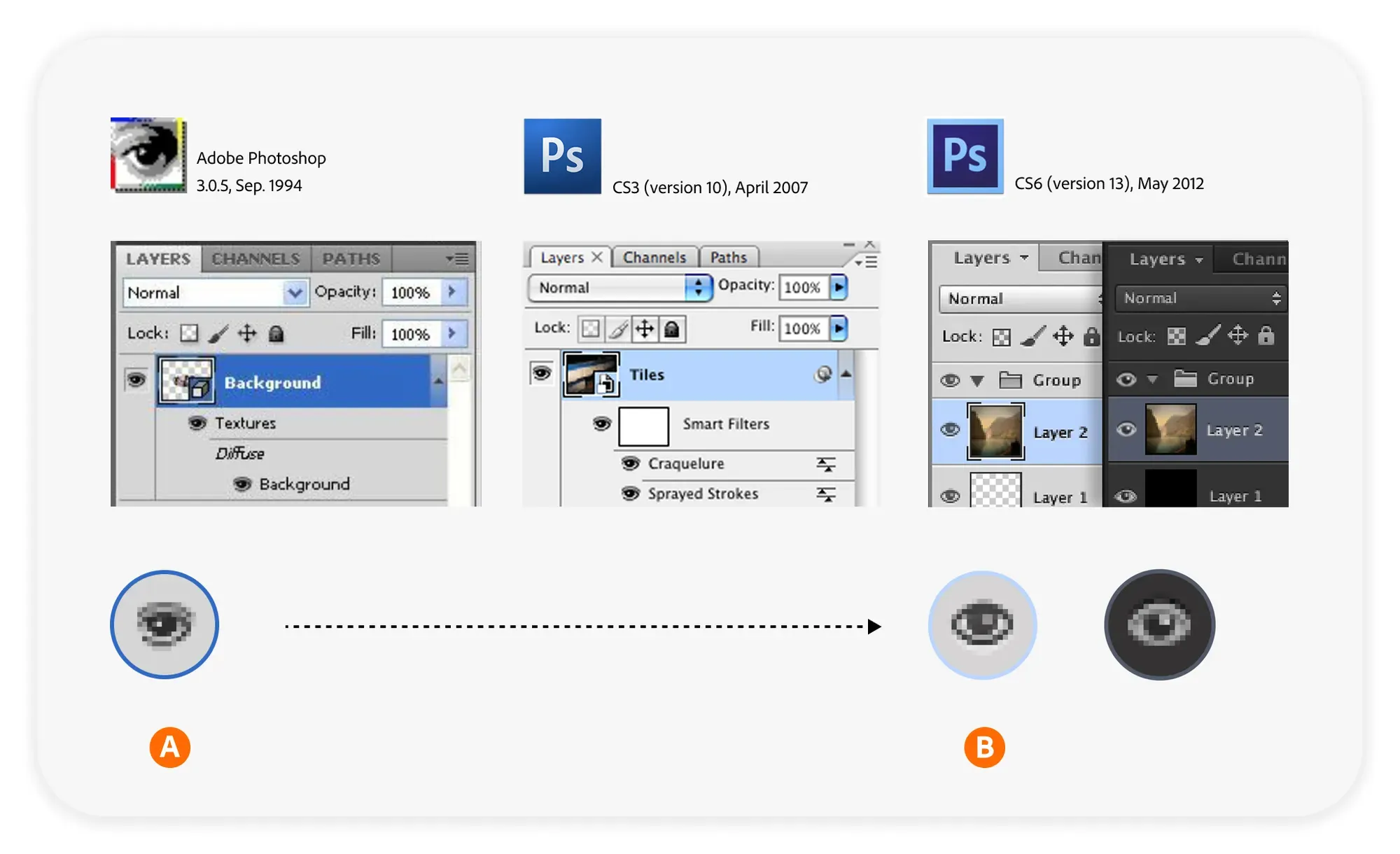 后来推出深色版本的PS,写实的“眼睛”看着有点怪,就重新设计了在浅/深背景下效果差不多的版本B。