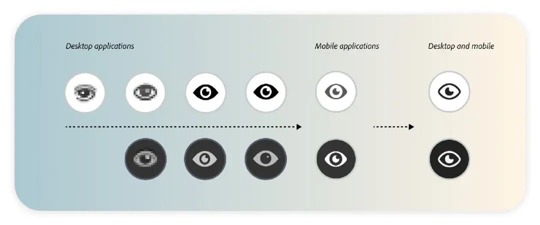 同时,针对浅深不同的颜色模式,“眼睛”图标在保持形状不变的情况下反转了颜色,这样在不同平台或者设备中都能使用样式更统一的图标。