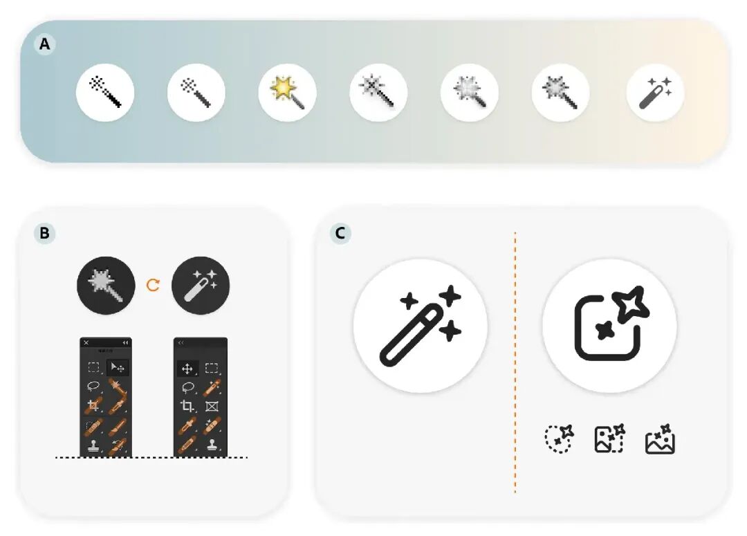 在新版PS中,“魔棒”图标保留了原来的闪光样式,重新调整了闪光元素的位置、大小和旋转角度。从最开始的单个A版样式,改成了旋转后的B版样式,最后用了三个独立闪光元素的C版样式,彻底和AI功能区分开。