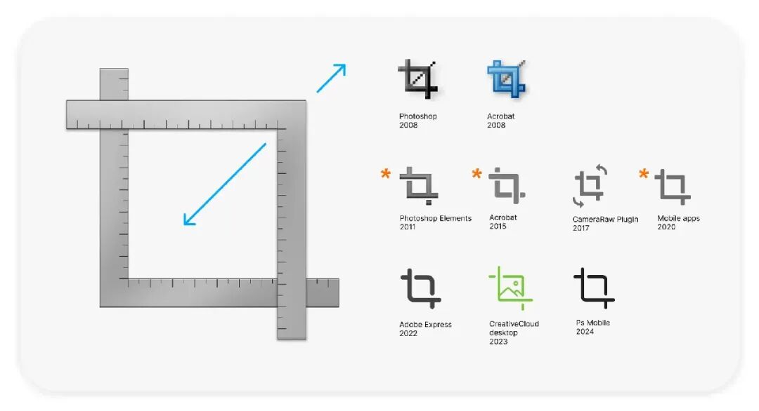 从Photoshop 1.0版本开始,“裁剪”图标就存在了。它的设计灵感,来自暗房里洗照片时用的遮罩框,特别是框上的角线。这么多年“裁剪”图标虽有小调整,但一直是个经得起时间考验的经典符号。
