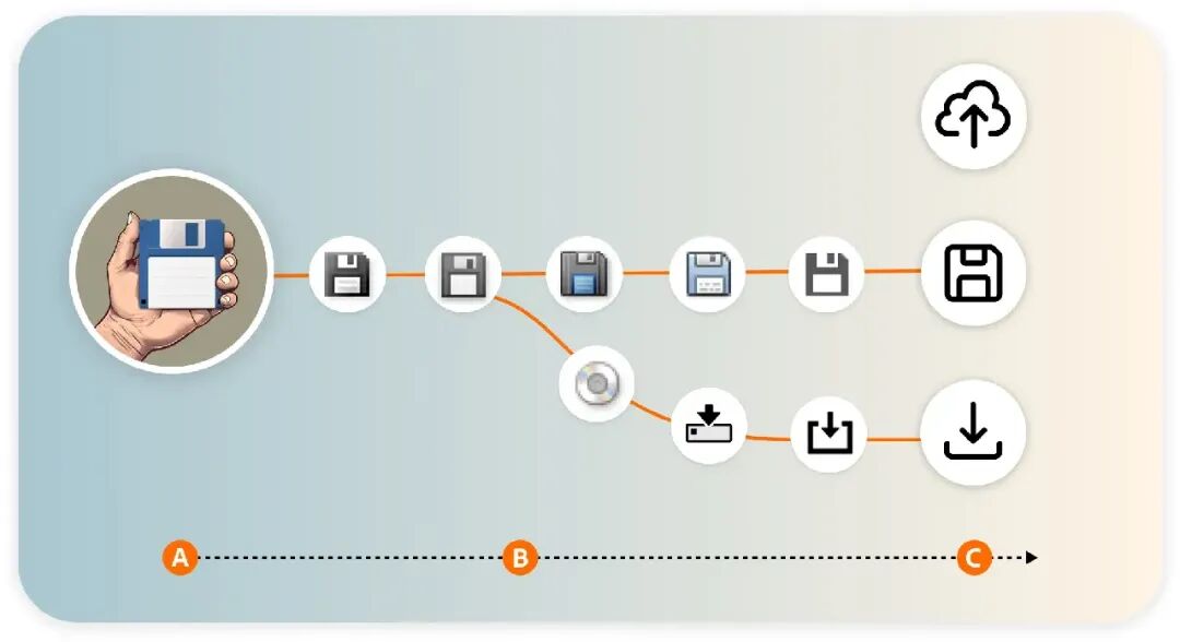 从最开始代表软盘的A版图标,到后来代表光盘/硬盘的B版图标,再到现在代表保存到云端的C版图标,它的含义一直在延伸。