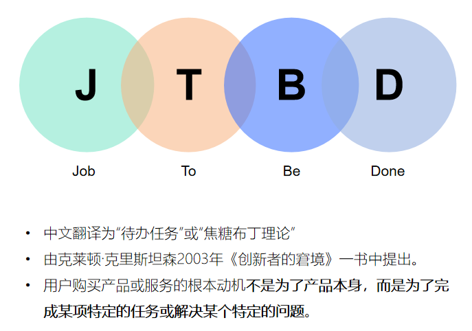 JTBD(Jobs-to-Be-Done待办任务理论),中文里趣称为“焦糖布丁理论”,是由哈佛大学商学院教授克莱顿・克里斯坦森(Clayton Christensen) 及其团队提出的用户研究与创新理论,跳出了传统用户细分(年龄 / 性别 / 地域)或产品功能的思维局限,从用户行为目的出发,解释用户决策的本质,为产品创新、营销定位和用户体验设计提供底层逻辑。