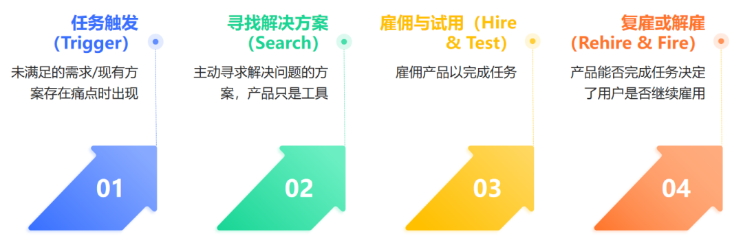 JTBD 认为,用户“购买 / 使用决策“本质是 “任务触发→寻找解决方案→评估是否完成任务”的闭环,具体可拆解为 4 个步骤: