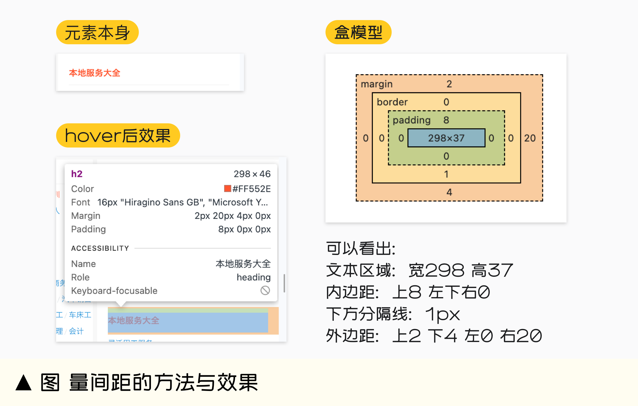 DevTools 能将这个模型可视化展示,让你清楚看到每一层的数值,从而与设计稿进行比对,精准定位间距问题的根源。