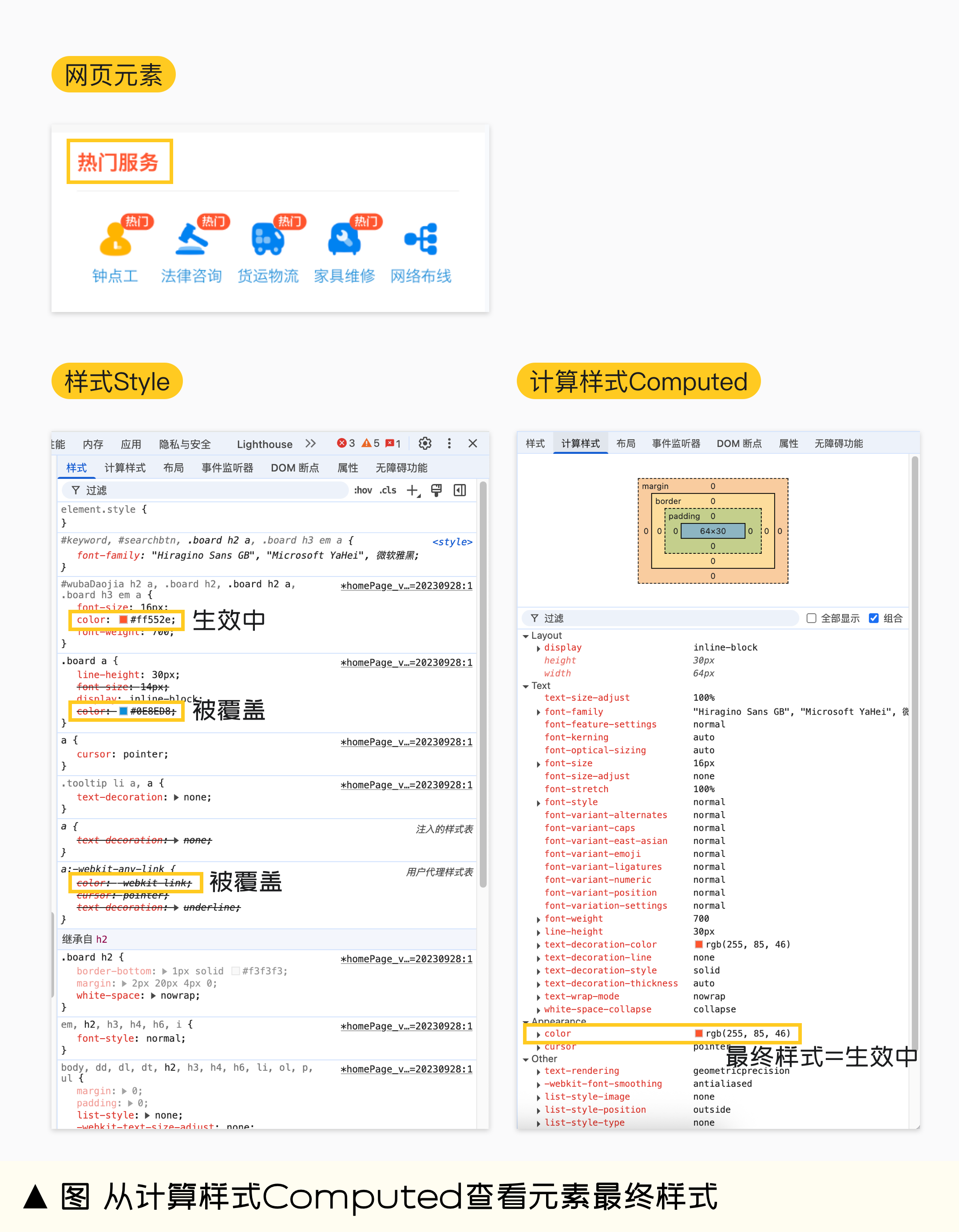 它显示了元素最终的样式,更直观,更适合回答:最终字号是多少?行高值是多少?是否有透明度?宽高是多少?