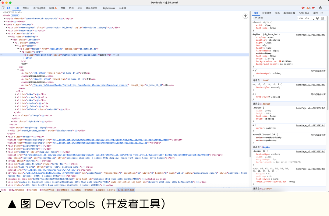 DevTools(Developer Tools,开发者工具)是现代浏览器自带的一套网页检查与调试工具,用于查看网页的结构、样式、脚本、网络请求和性能等信息。它能够实时展示页面背后的代码和布局,并允许用户在本地修改样式、观察变化。