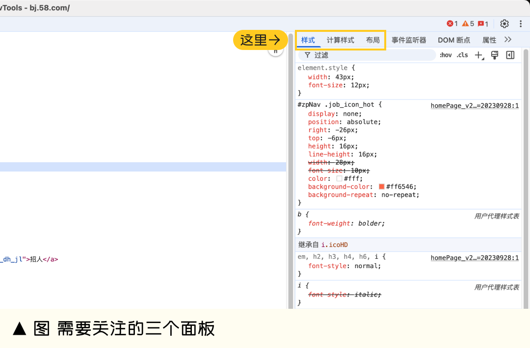 我们不需要懂它,只需要关注与UI走查密切相关的三个面板:样式Styles(样式规则)、计算样式Computed(最终计算值)、布局Layout(布局体系)。