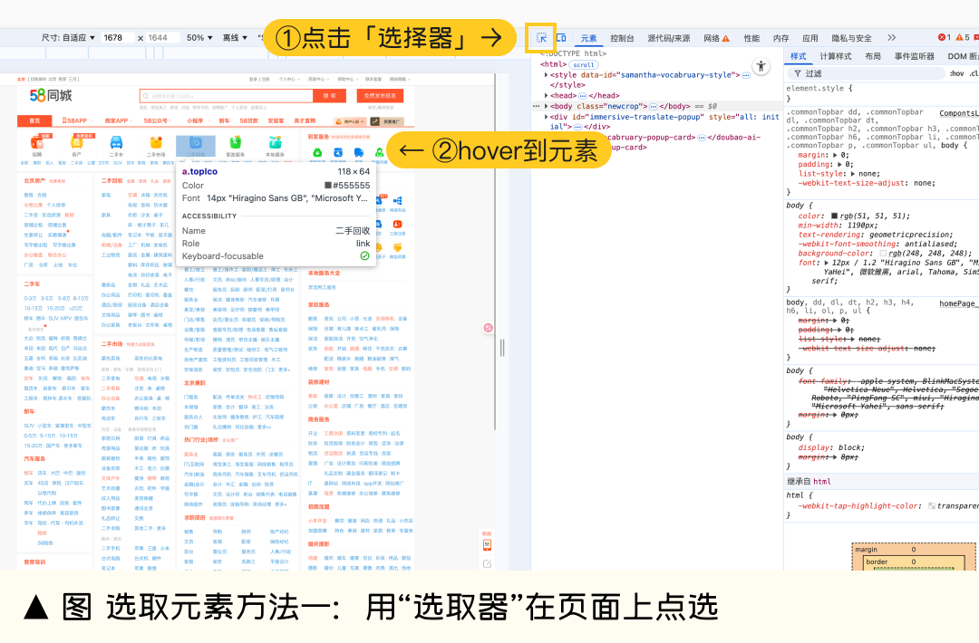 hover到具体元素,右键 → 检查(Inspect)适合按钮、标题、图标等肉眼识别明显的元素