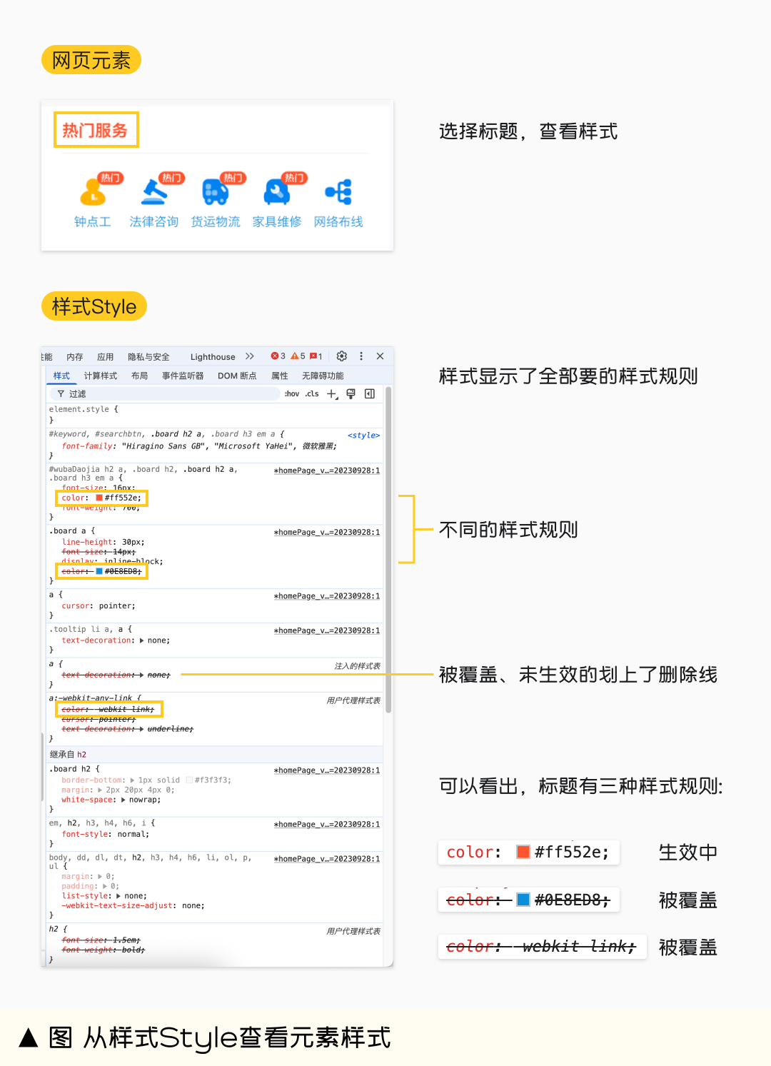 一是Styles 面板里的规则,是按从上到下的优先级排列:越靠上的规则优先级越高。我们只需要从上往下找即可。被覆盖的会被划上删除线,不再生效,直接忽略就行。