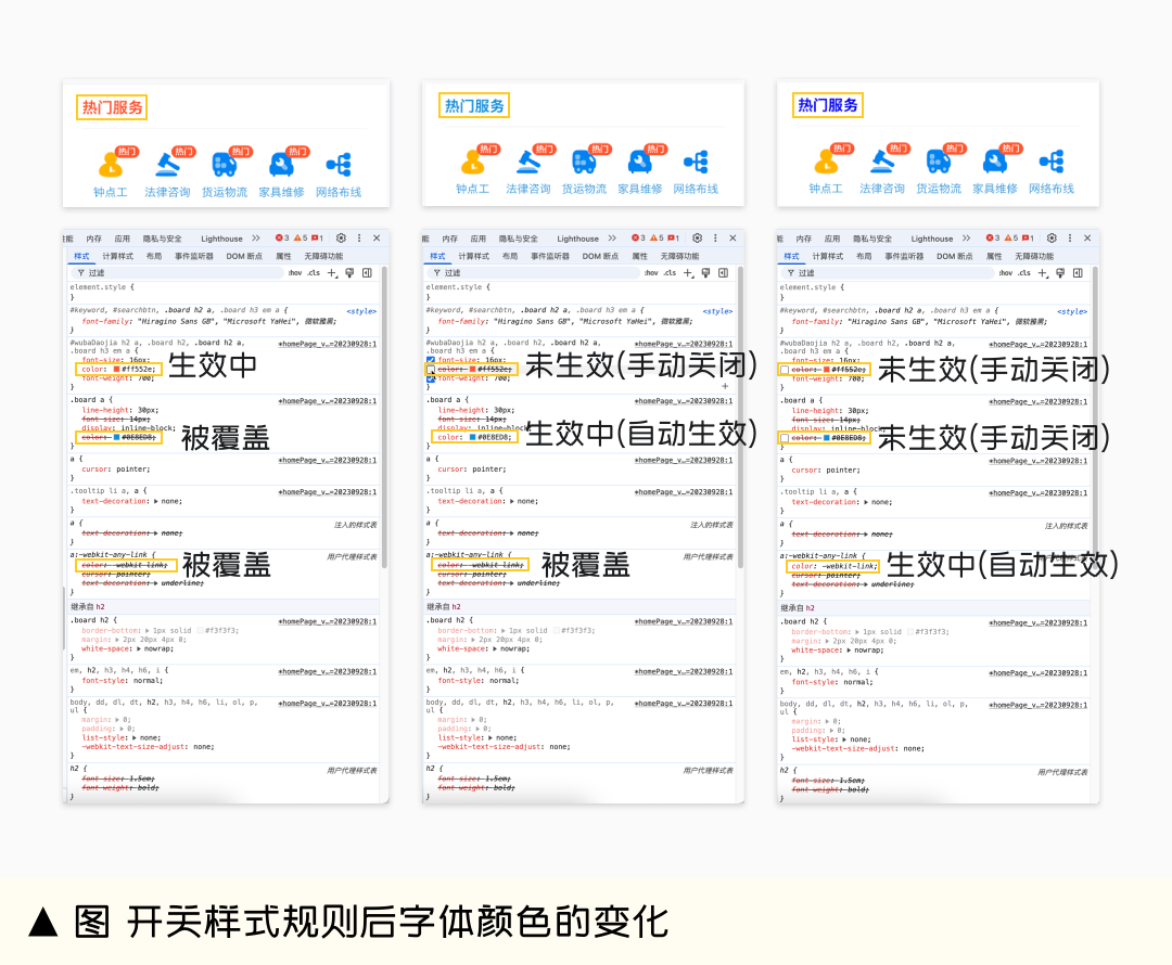 如果你发现同一个属性,比如font-size,出现了很多次,有的还被划上了删除线。也别奇怪,这代表有多个规则作用于它。