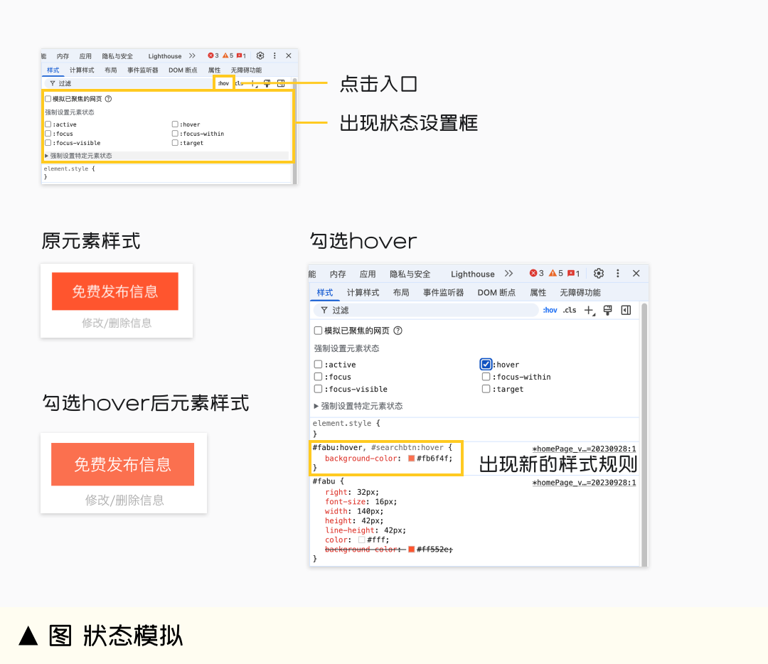 在 Styles 面板顶部点击 :hov,勾选对应状态即可模拟:hover、active、focus、visited……无需鼠标繁琐操作。