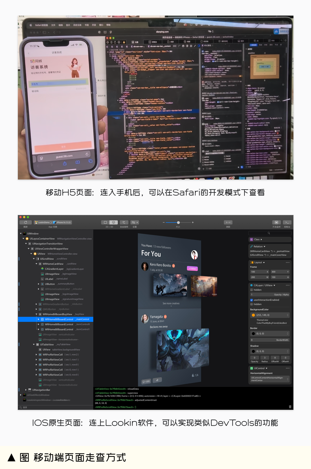 如果是 App 内的 H5 页面(WebView),你可以通过真机调试,直接用 DevTools 查看。如果是原生 UI(比如 iOS 的 UIKit、SwiftUI),DevTools 就无能为力了,需要用专门的工具,比如 Lookin。