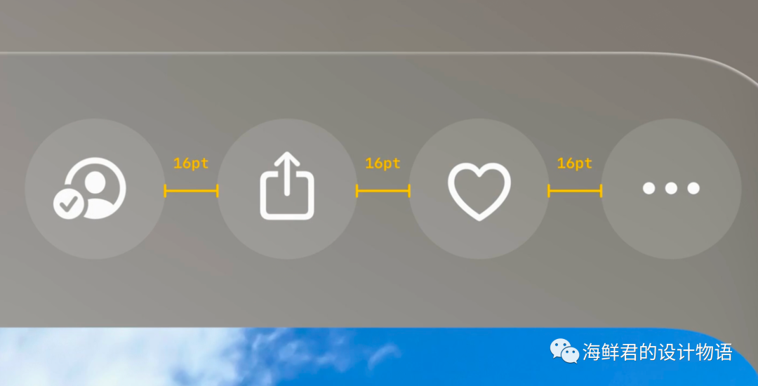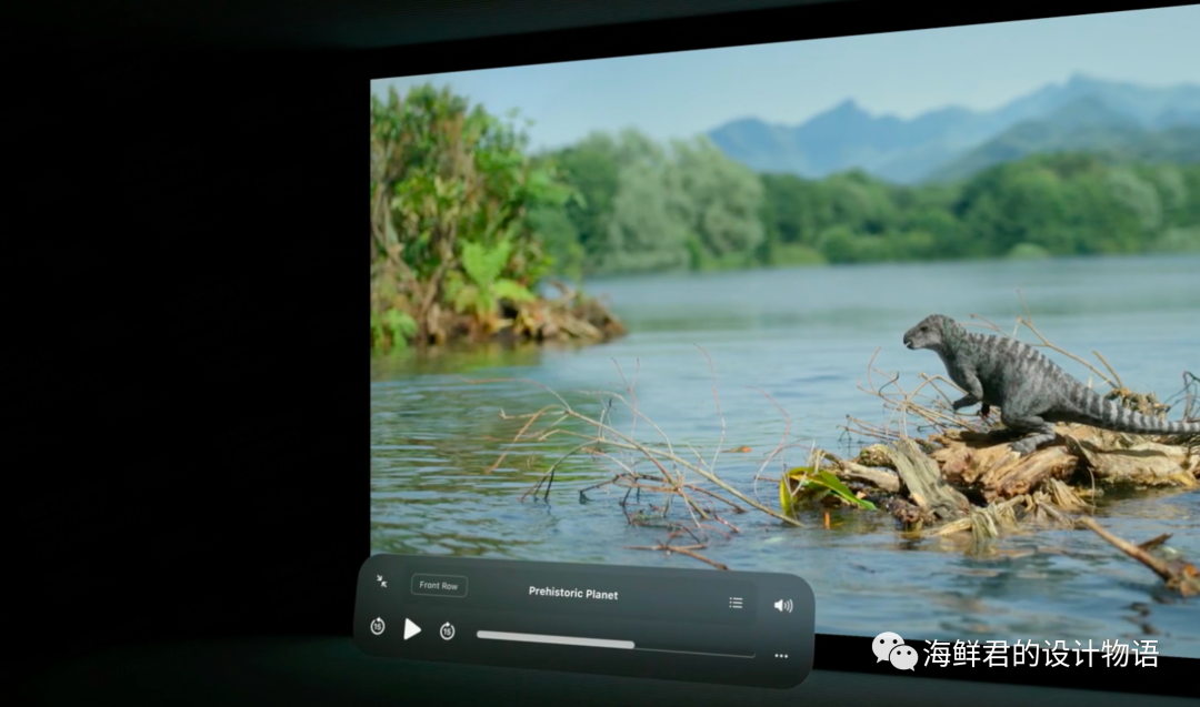 重点特征的迁移:在视觉表现上,他们迁移了其他终端最具有代表性的设计表现—毛玻璃;除了通用性的考虑以外,毛玻璃也有很好的与现实世界区分的特性,这让我联想到手机上毛玻璃效果与其他页面的关系,苹果这里只是把“现实世界”当做了手机里的那个被毛玻璃压盖的页面。这样的继承性很好的被苹果给用到了空间设计中,而这样毛玻璃的效果也显得更加有质感(我们当时也有考虑过用这样的设计风格,但是受限于各个方面最后没有实现,还是有点遗憾)