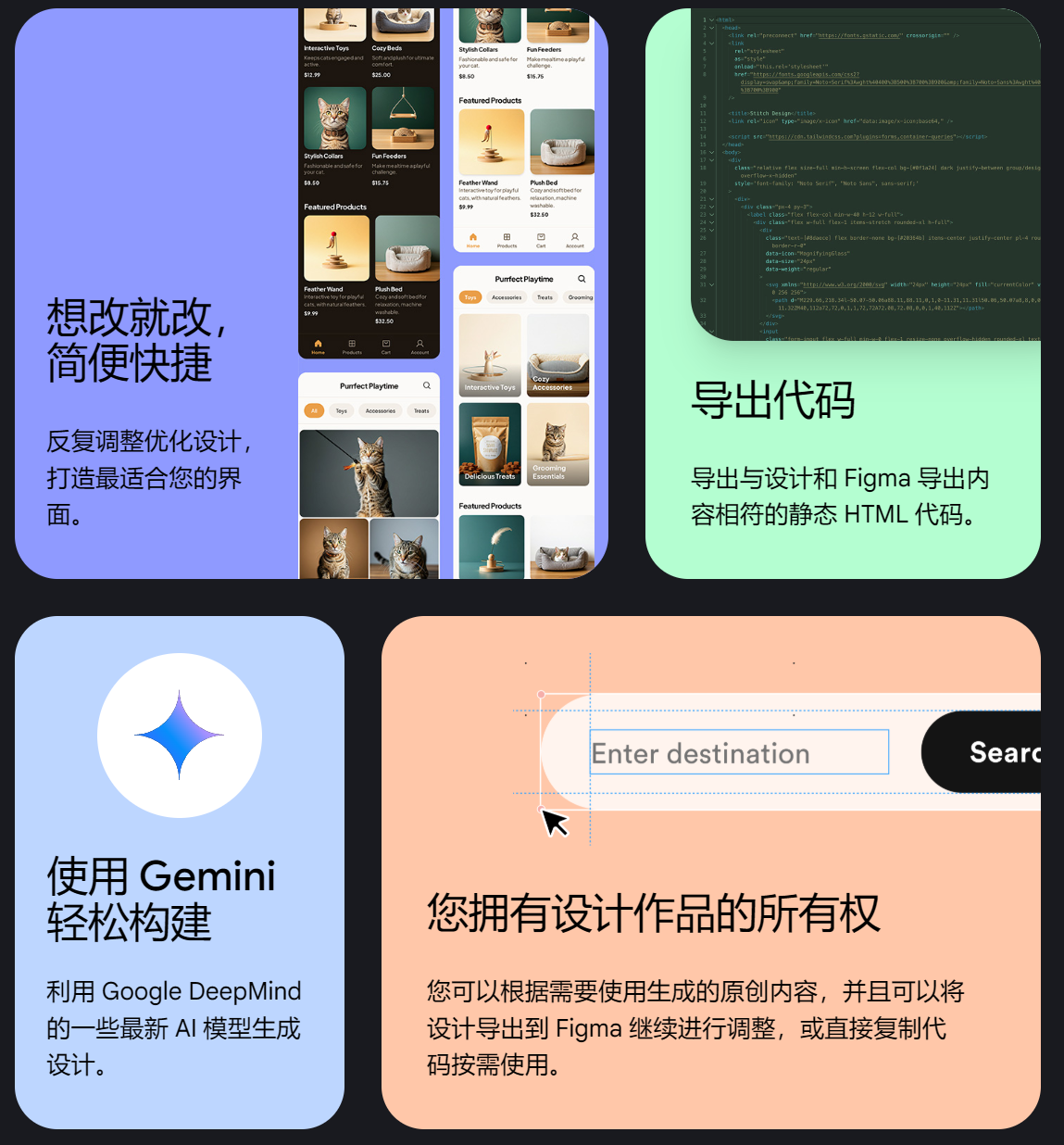 Stitch 接入了 Google 的 Gemini 大模型能力。它能根据简单的指令自动生成符合设计规范的布局方案,或针对不同文化背景自动调整 UI 调性。