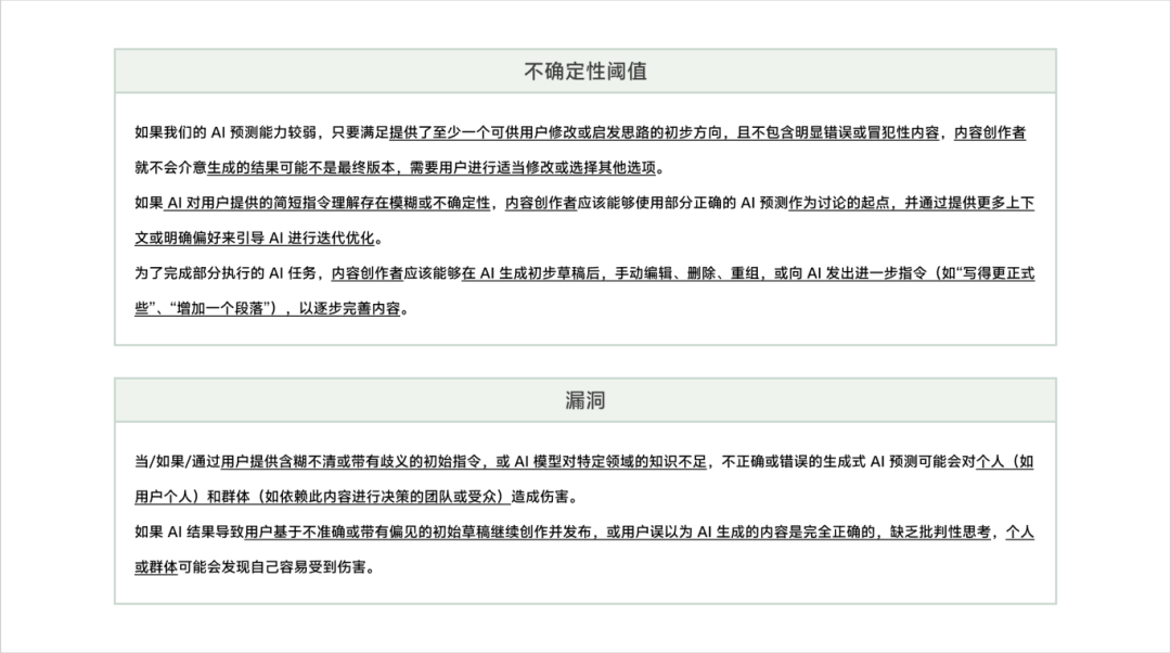 针对每个关键时刻定义产品标准,可以从可接受的行为、不可接受的行为、不确定性阈值(即 AI 不确定性输出的处理标准)、漏洞(即风险点) 4 个维度来思考: