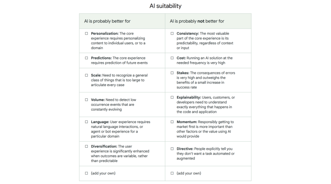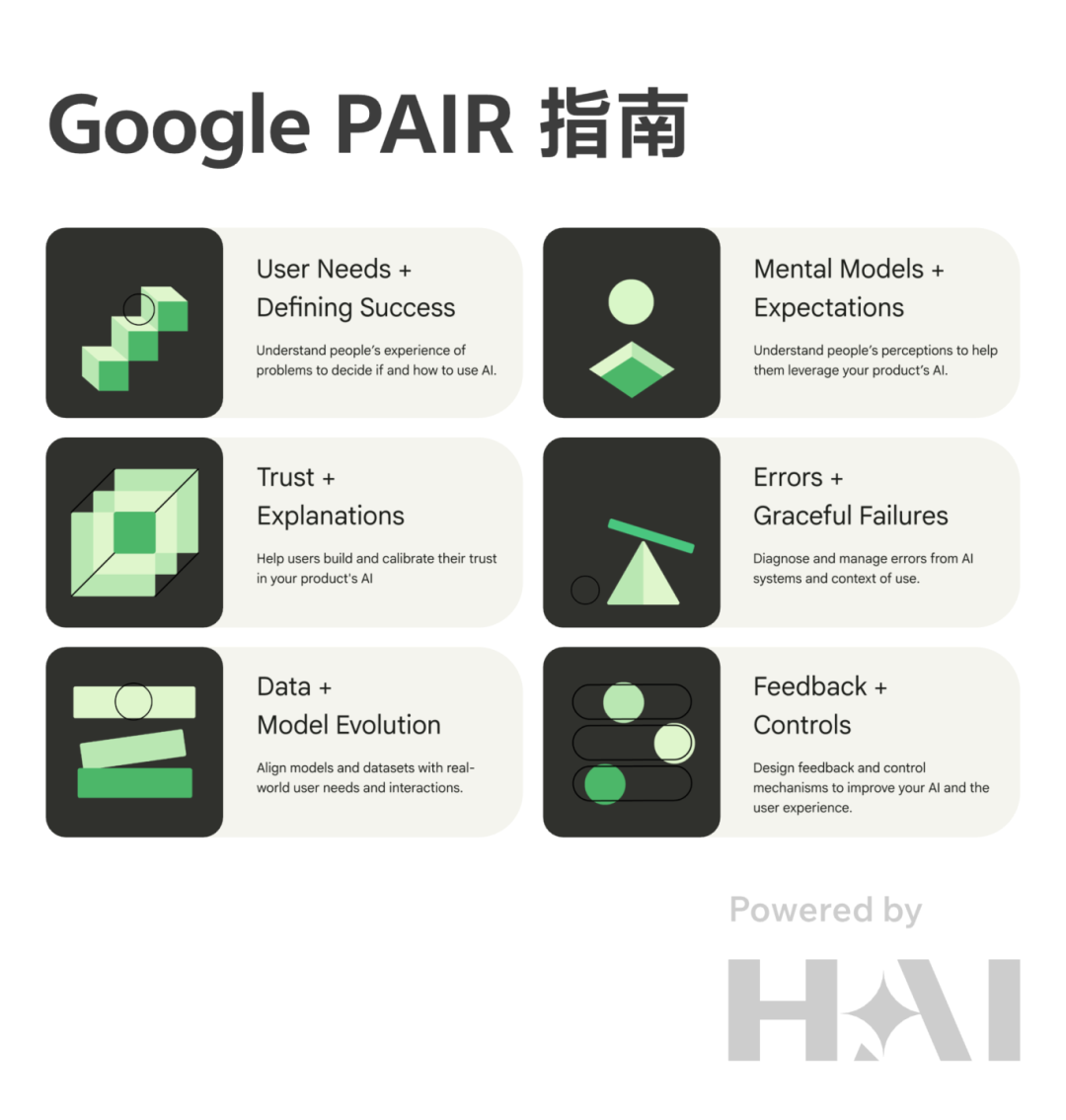 Google 的 PAIR 指南为产品团队从零开始构建 AI 产品提供了清晰而实用的路线图。它将以人为本的设计定位为产品成功的核心,这意味着 AI 不应仅是技术叠加,而应始终将用户置于设计的核心。