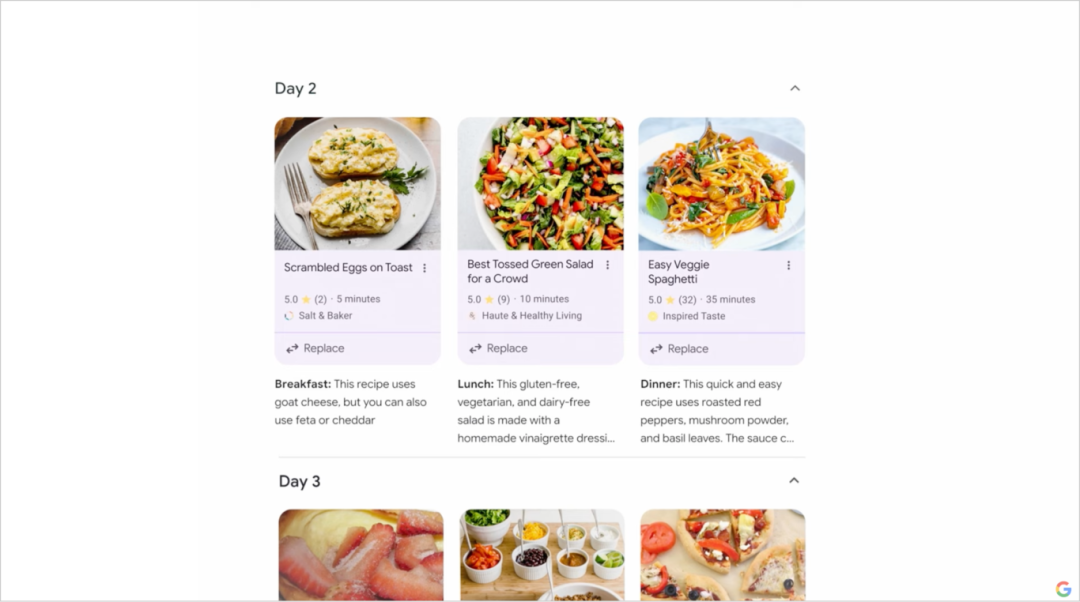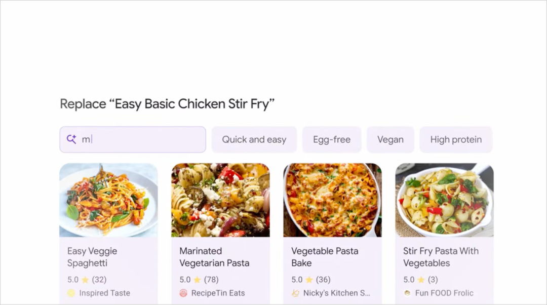 当 Gemini 生成的食谱不符合用户个人偏好时,Gemini 会提供“替换”操作,同时向用户提供搜索建议:“快速简单”、 “纯素食” 、 “高蛋白”……