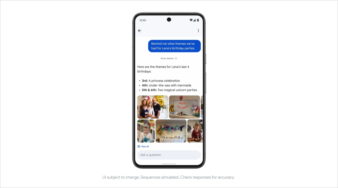 过去,人们习惯于在相册中通过关键词搜索,然后滚动浏览大量照片以翻找正确的一张。Google 相册推出的由 Gemini 驱动的 Ask Photos 功能在现有交互基础上扩展,用户可以使用更自然的语言提问,例如“展示我游览过的每个国家公园里最好的一张照片”或者“莉娜过去生日派对的主题都是什么”。用户对于功能的心智模型逐步由“关键词搜索”扩展为“能跨越时间和地点、理解复杂语义、甚至从照片细节中提炼信息的智能助手”。