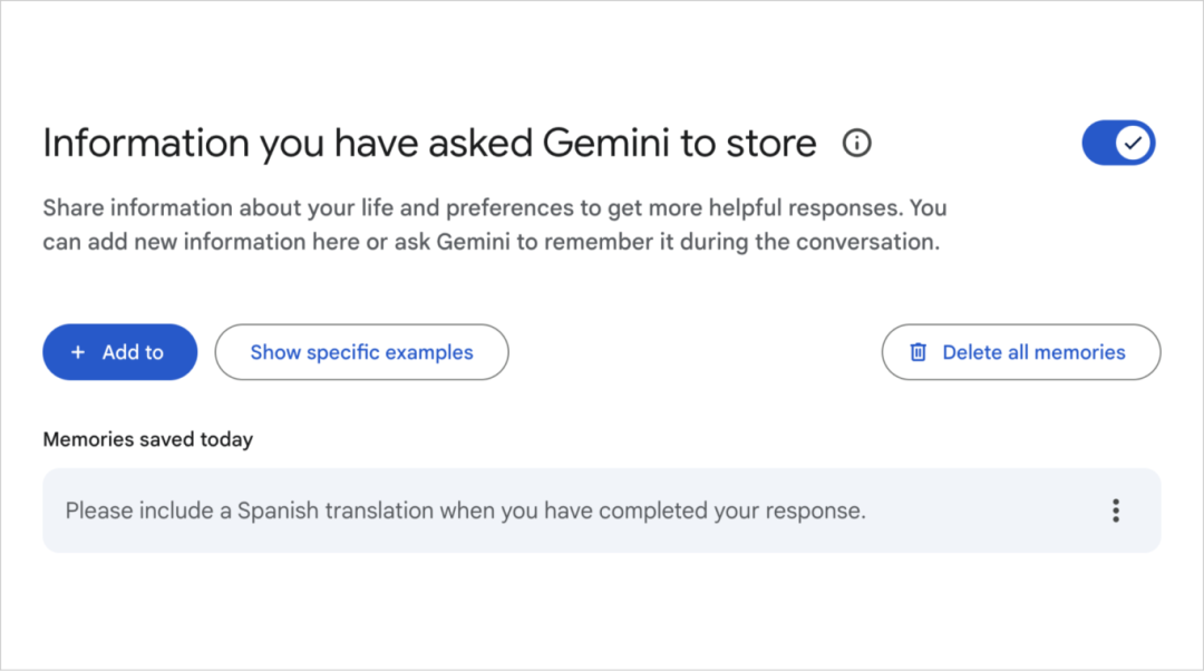 在 Gemini 中用户可以设置并保存与其个人生活和偏好相关的信息,如“我是素食主义者,所以不要推荐含肉的食谱”、“回答完毕后,请附上西班牙语翻译”等。用户可以随时修改或添加信息,或者清除所有记忆。
