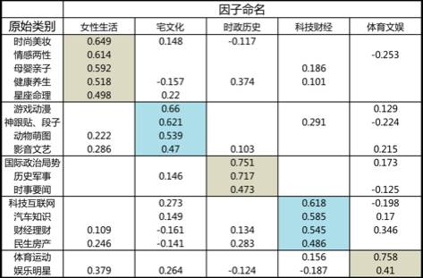 聚类分析仍使用SPSS完成,结果如下表所示。表格中数字代表每类用户对特定内容的偏好程度,数字越大偏好程度越高。根据几类用户的内容偏好模式分别起一个鲜明易记的名字,例如,给更偏好“女性生活”与“宅文化”内容的用户打上“时尚丽人”的标签。