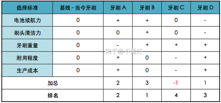 一个新的设计方案可能在电池续航能力上优于基准方案(标记为 “+”),但在价格上可能会高于基准方案(标记为 “-”)。
