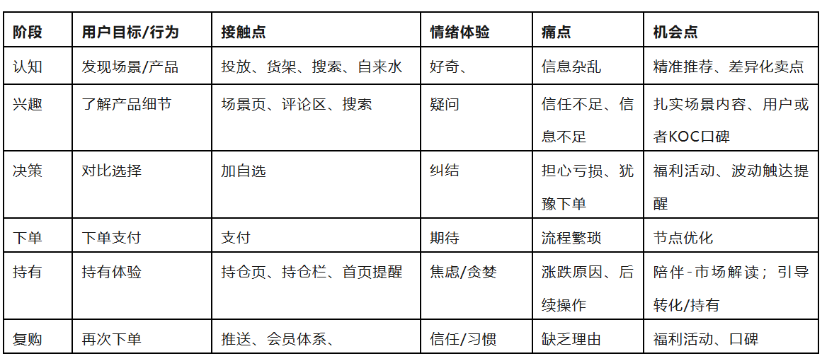 • 互动行为:内容偏好(图文/视频/直播)、功能使用(定投/转换/组合)、社区活跃