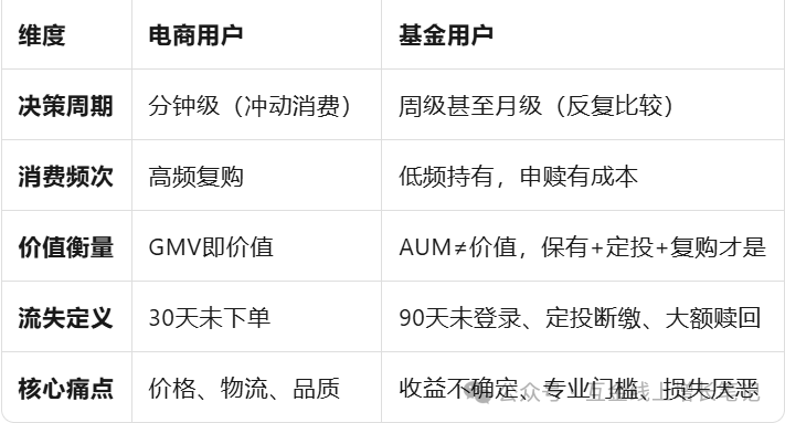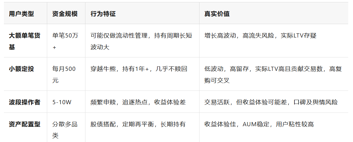 所以不要用”客单价”定义用户价值,可以参考“资金久期×产品复杂度×互动深度”的三维模型综合来看。一个月定投1000元的客户,用户价值可能远高于一次性买10万货基的所谓大客单。