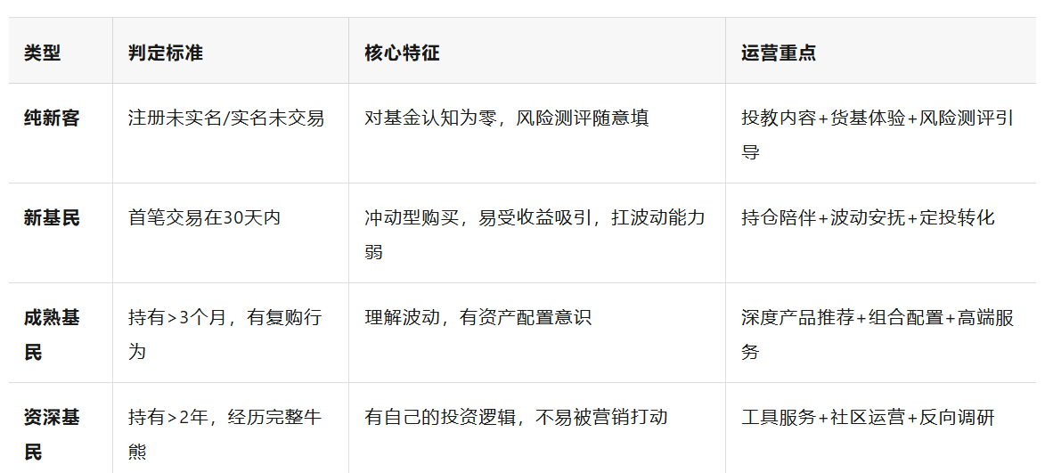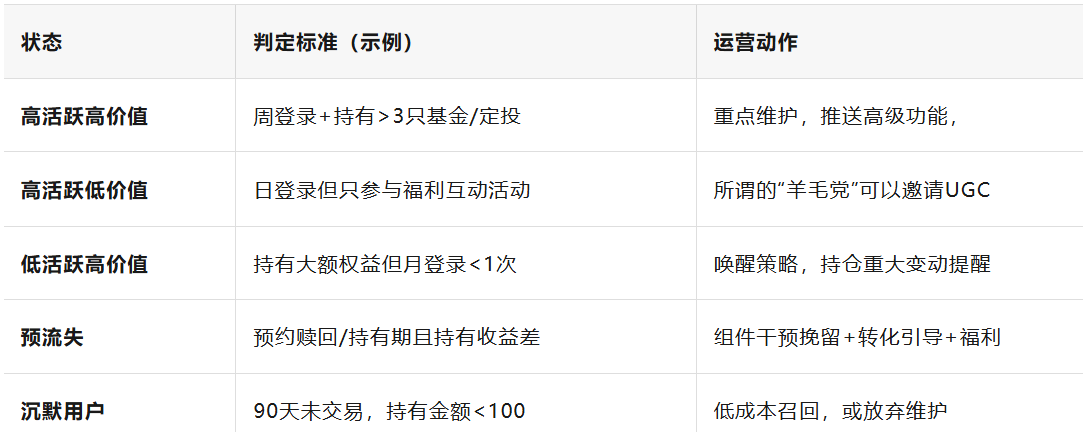 关键设计:基金用户的”活跃”不能只看交易频次,这和投资引导的不要追涨杀跌相悖,要看“账户操作+内容互动+社区行为”的组合。一个每天看净值高频交易的用户,和一个几乎一个月才登录一次的持有期债基的用户,前者可能是焦虑型持有者(流失风险高),后者可能是投资心理更健康用户。