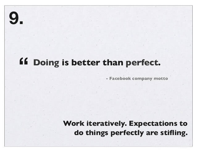 9.迭代工作,期待完美收工会令人窒息:“做完事情,要胜于完美收工” Facebook 办公室墙壁上贴的箴言。动手做,胜过任何完美的想象