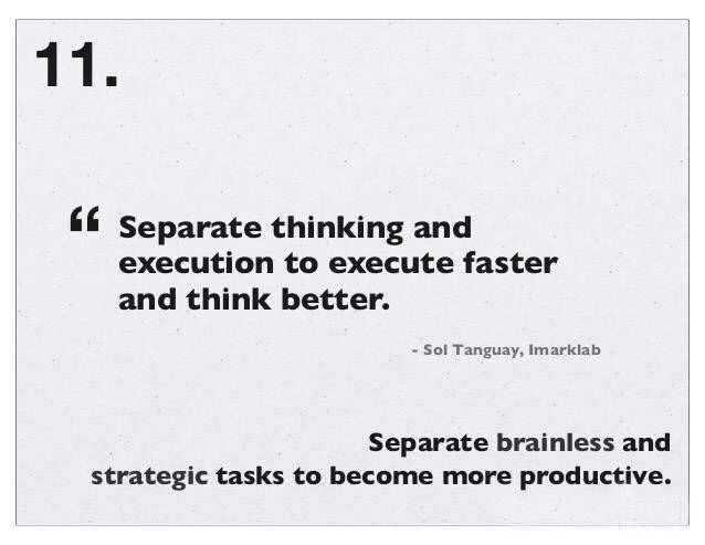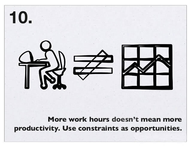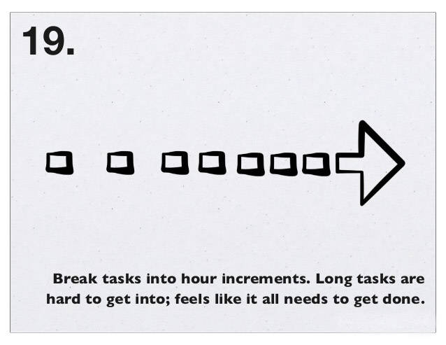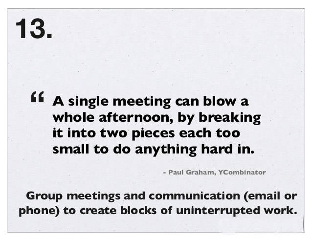 13.把会议和沟通 (邮件或电话) 结合,创造不间断工作时间:一个小会,也会毁了一个下午,因为它会把下午撕成两个过小的时间段,以至于啥也干不成。PS:当看到一个程序员冥思苦想时,不要过去打扰,甚至一句问候都是多余的。