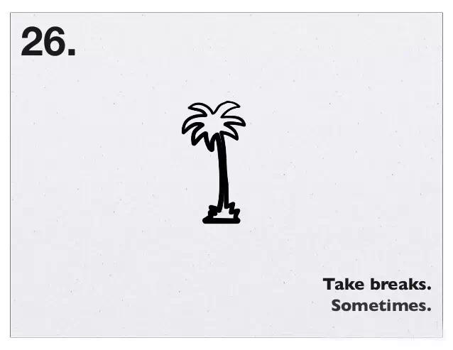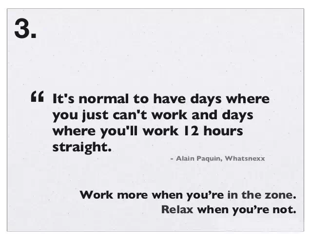 3.当你在状态时,就多干点;不然就好好休息:有时候会连着几天不是工作状态,有时在工作状态时却又能天天忙活 12 小时,这都很正常的。