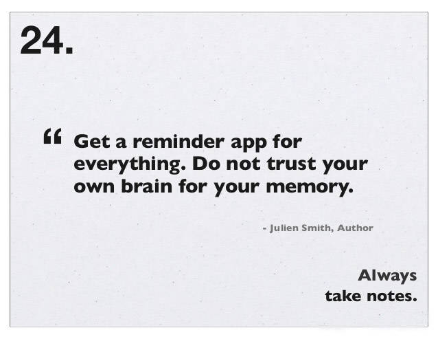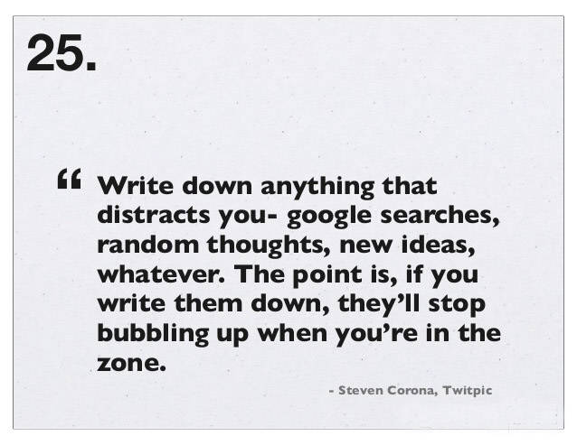 25.进入高效状态后,记下任何分散你注意力的东西比如Google搜索词、灵光乍现的想法、新点子等等。如果你把它们记下来,它就不会在蹦来蹦去了。