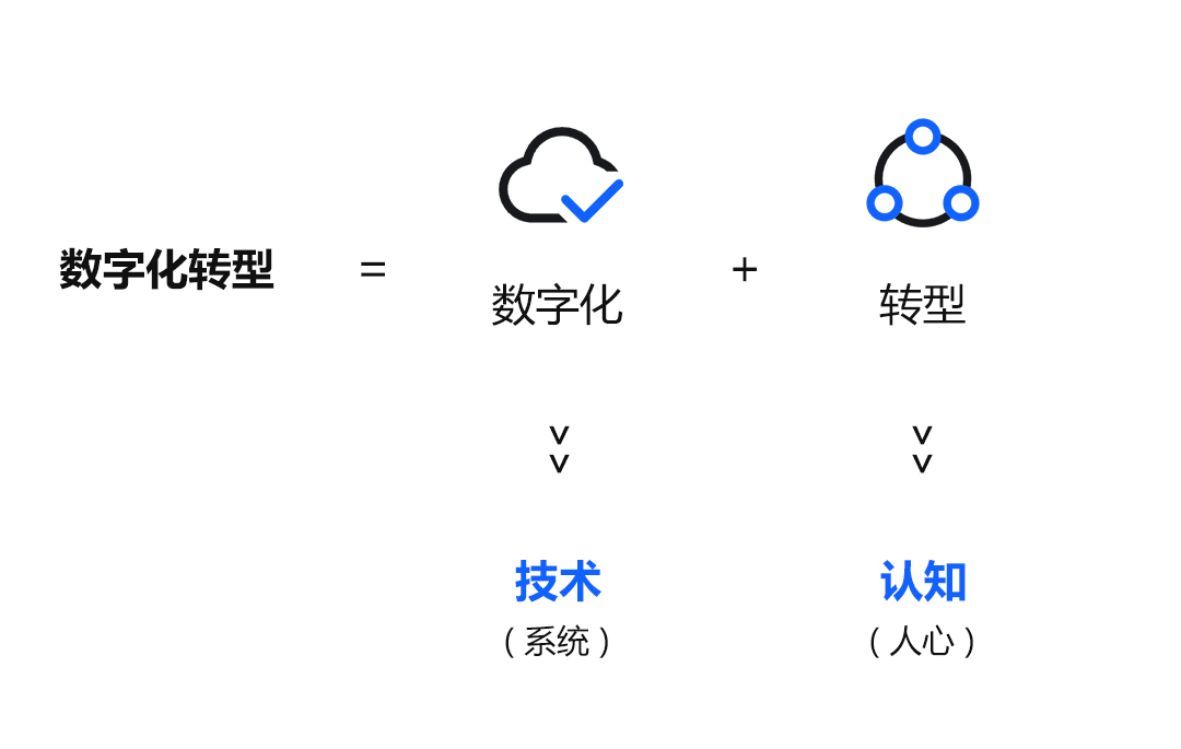 复杂的事情简单做,可以把“数字化转型”简单拆成2个词「数字化:技术与系统」「转型:认知与人心」。