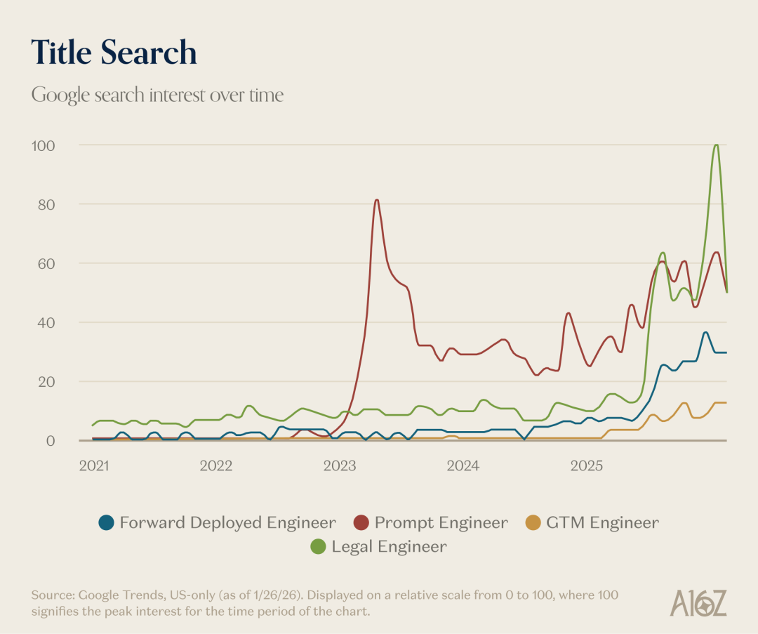 Tom Hollands给出的区分标准很清晰:关键在于工作本身是否发生了真正的根本性转变。”Prompt engineer”(提示工程师)这个由Scale AI开创的头衔,现在已经感觉过时了,因为它描述的工作——编写提示词——最终被证明是每个工作的一个特性,而不是一个独立的工作。这个头衔跑在了现实前面。但”GTM engineer”或”legal engineer”描述的是公司真正需要的全新技能组合。