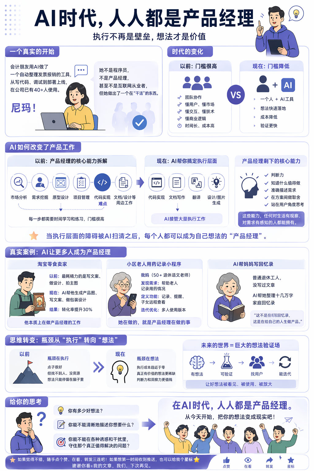 我不是在说AI让一切变得完美,也不是在说产品经理这个岗位会消失。恰恰相反,我觉得产品经理这个岗位会变得更重要,因为AI可以执行,但判断还得人来。