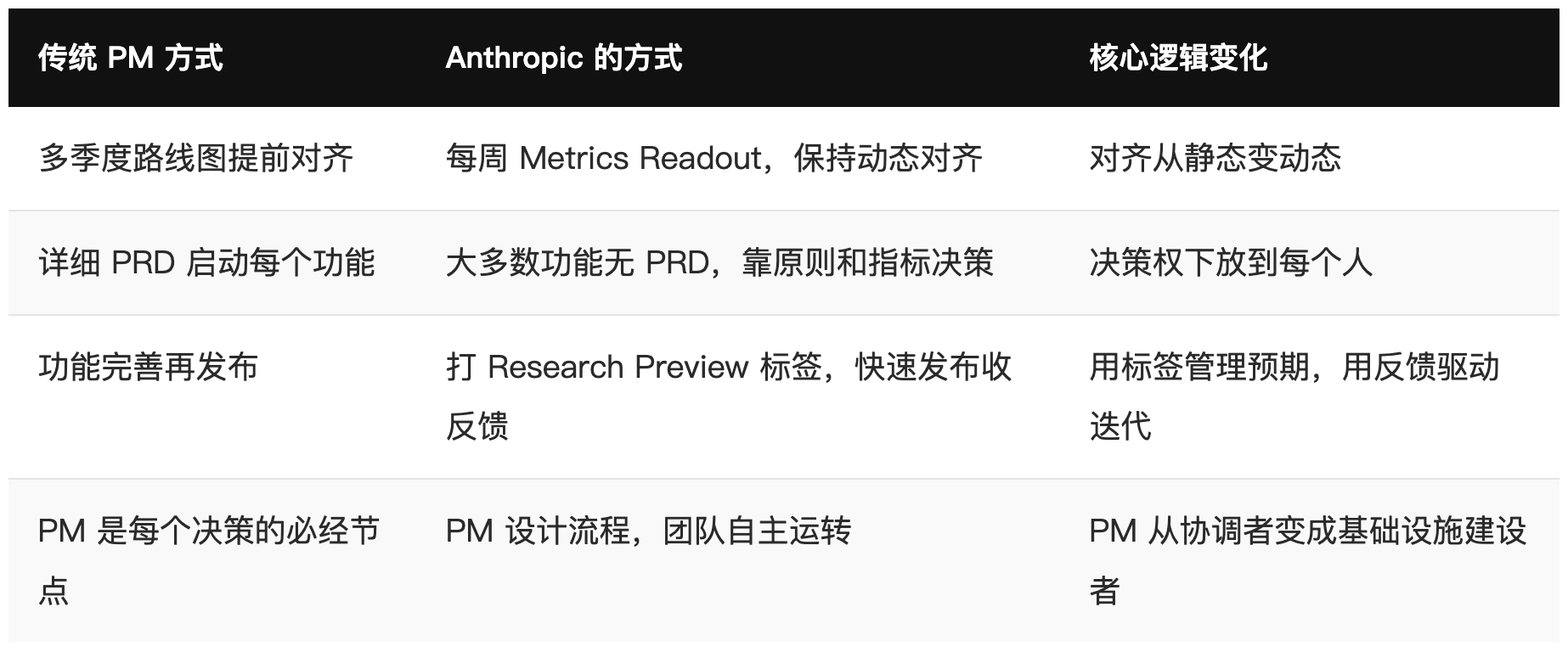 当所有人都真正理解指标时,他们就能在没有 PM 拍板的情况下,自己判断一个决策是对还是错。这是 Anthropic 能够高速运转的关键基础之一。